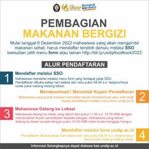 Menindaklanjuti arahan Rektor Universitas Diponegoro, saat ini bidang akademik dan kemahasiswaan bekerja sama dengan bidang komunikasi dan bisnis telah mengembangkan sistem pendaftaran makanan sehat. Sehubungan dengan hal tersebut, berikut kami informasikan ketentuan pendaftaran makanan sehat: Mulai 6 Desember 2022, mahasiswa yang akan mengambil makanan sehat harus mendaftar terlebih dahulu melalui https://form.undip.ac.id/makanansehat/pendaftaran Pendaftaran akan dibuka setiap hari […]