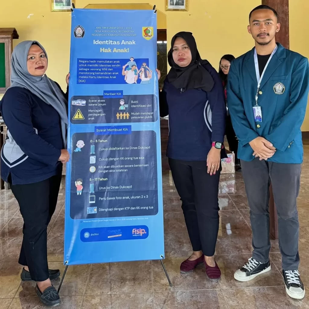 Wonogiri (27/07/2024) – Dalam era digital yang semakin pesat, penting bagi setiap individu memiliki identitas yang tercatat secara resmi. Tidak terkecuali bagi anak-anak. Namun, masih banyak orang tua yang belum menyadari pentingnya Kartu Identitas Anak (KIA). Melihat kondisi tersebut, mahasiswa Kuliah Kerja Nyata (KKN) Universitas Diponegoro menginisiasi sebuah program edukasi bagi kader PKK di Desa Kerjo […]