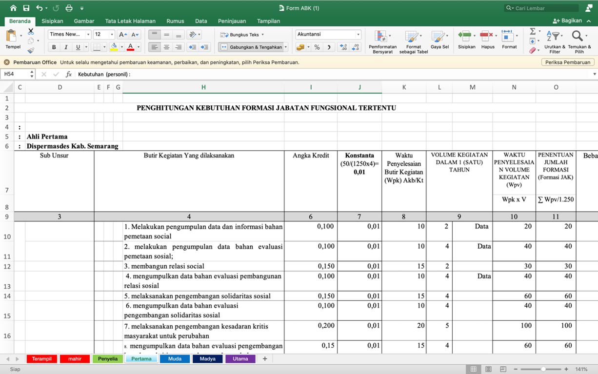 Terwujudnya ASN BerAKHLAK perlu dilakukannya analisis jabatan salah satunya dalam penghitungan kebutuhan formasi jabatan. Hal ini selaras dalam usaha terwujudnya ASN BerAKHLAK mengingat isi dari core values tersebut adalah ASN yang selalu memenuhi kebutuhan masyarakat dan memiliki kompetensi serta kualitas melaksanakan tugas yang terbaik. Dalam kegiatan pelaksanaan penghitungan kebutuhan formasi jabatan dilakukan pula oleh mahasiswa Administrasi Publik FISIP UNDIP pada kegiatan magang di Dinas Pemberdayaan Masyarakat dan Desa Kabupaten Semarang. Peran pemagang dalam pelaksanaan penghitungan kebutuhan formasi jabatan adalah melakukan penghitungan jabatan fungsional yang terdiri dari ahli pertama, ahli muda, ahli madya, dan ahli utama. Tujuan dari melakukan penghitungan kebutuhan formasi jabatan yakni untuk mengetahui kebutuhan jabatan yang ada sehingga tidak terjadi adanya kelebihan bahkan kekurangan pegawai. Tujuan lain dari penghitungan kebutuhan formasi jabatan juga didasarkan pada harapan pemerintah untuk memiliki sumber daya manusia ASN yang profesional sesuai dengan kualifikasi yang dibutuhkan sehingga nantinya berdampak pada kinerja organisasi yang baik pula. Penyusunan penghitungan kebutuhan formasi jabatan ini berpegang pada visi dan misi organisasi agar memberikan dampak terhadap tercapainya tujuan organisasi. Penghitungan kebutuhan formasi jabatan juga dapat membantu organisasi untuk lebih efisien serta efektif dalam mencapai kinerja organisasi.