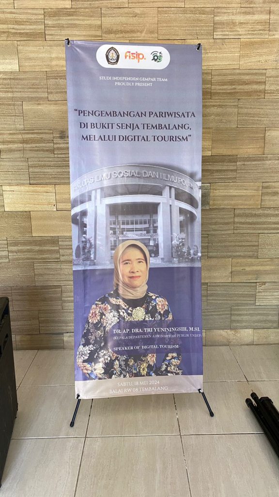 Sabtu, Tanggal : 18 Mei 2024 tim mahasiswa studi independence Prodi S1 Administrasi Publik melaksanakan rangkaian kegiatan dalam rangka turut berperan mengembangkan pariwisata khususnya di Pokdarwis Bukit Senja kelurahan Tembalang kota Semarang. Topik yang diangkat pada kegiatan ini antaralain tentang Digital Tourism: ” Solusi berwisata dengan pemanfaatan digital tourism dalam pengembangan wisata bukit senja”. Target atau sasaran peserta kegiatan adalah anggota karang taruna di RW 08 di kelurahan Tembalang.Kegiatan ini didampingi oleh Dr.AP.Dra.Tri Yuniningsih,MSi ( Ketua Departemen Administrasi Publik/ Dosbing ) diikuti oleh 20 orang mahasiswa Prodi S1 Administrasi Publik semester empat ( Angkatan 2022).