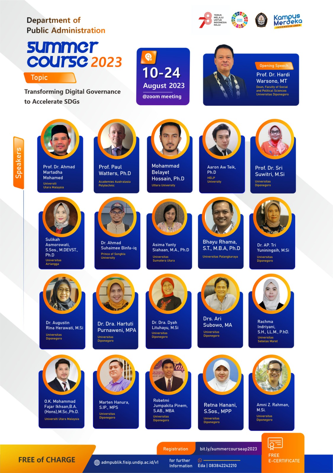 Departemen Administrasi Publik FISIP-UNDIP telah menyelenggarakan kegiatan Summer Course 2023, dimana kegiatan ini adalah event tahunan ketiga. Kegiatan ini telah menghadirkan Narasumber dari dalam dan luar negri. Sesuai dengan topik tahun ini tentang transforming digital governance to accelarate SDGs.