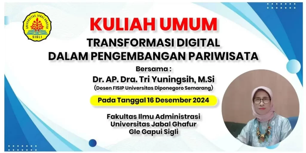 Aceh, 16 Desember 2024 – Universitas Jabal Ghofur, Aceh, menggelar kuliah umum dengan menghadirkan narasumber ternama, Dr. AP. Dra. Tri Yuniningsih, M.Si. Kegiatan yang berlangsung pada hari Senin ini mengangkat topik “Transformasi Digital dalam Pengembangan Pariwisata.” Dalam penyampaian materinya, Dr. Tri Yuniningsih menjelaskan bahwa transformasi digital di sektor pariwisata, atau Digital Tourism Transformation, merupakan salah […]