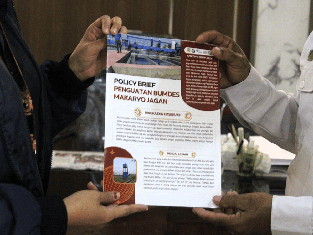 Jagan Village, July 31, 2024 – Community Service Program (KKN) team II 2023/2024 students from Universitas Diponegoro implemented a work program by presenting a Policy Brief to improve the BUMDes Makaryo Jagan. The Policy Brief was handed over by Nidaul Husna, a student of KKN TIM II 2023/2024 at Diponegoro University, to Mr. Mariyo, the Head of Jagan Village, at the Jagan Village Office on Wednesday, July 31.