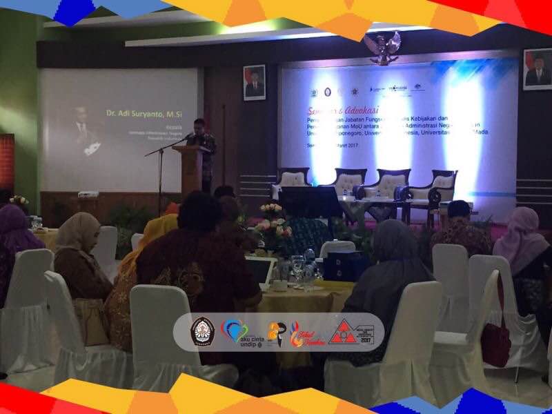 “Seminar & Advokasi, Pengembangan Jabatan Fungsional Analis Kebijakan dan Penandatanganan MoU antara Lembaga Administrasi Negara dengan Universitas Diponegoro, Universitas Indonesia, Universitas Gadjah Mada” di gedung A lt. 3 ruang auditorium FISIP UNDIP.