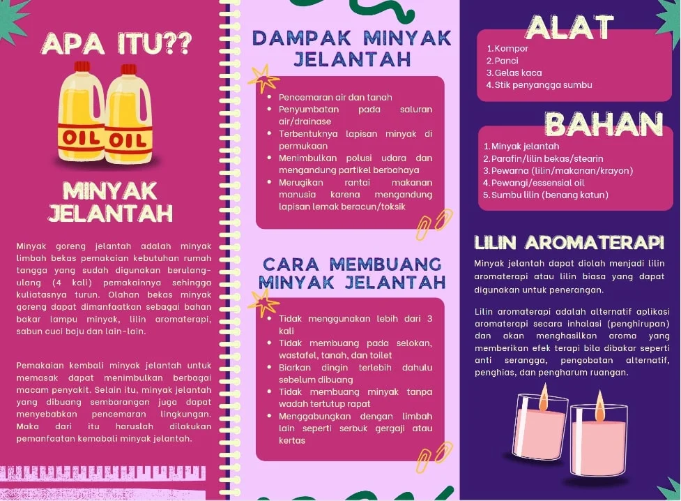 Hal tersebut membuat salah satu mahasiswa KKN Tim II Universitas Diponegoro Tahun 2023/2024 Indah Megaria, berinisiatif untuk mengubah minyak jelantah menjadi sebuah produk yang bernilai guna dan bermanfaat, yaitu lilin aromaterapi. Lilin aromaterapi adalah lilin khusus yang terbuat dari minyak esensial dengan aroma yang begitu menenangkan dan menyenangkan. Selain dapat mengurangi dan mencegah pencemaran lingkungan, lilin aromaterapi dari minyak jelantah ini juga memiliki nilai jual yang cukup menjanjikan sehingga dapat menjadi ide berwirausaha bagi warga setempat.