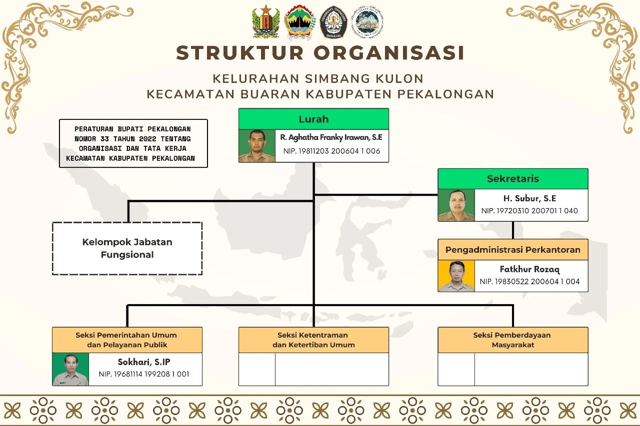 Kelurahan Simbang Kulon, Kecamatan Buaran, di Kabupaten Pekalongan baru saja menjalani pergantian struktur organisasi, yang dimana terpilihnya perangkat-perangkat kelurahan yang baru. Oleh karena itu, Mahasiswa KKN TIM II UNDIP Krisna Aryasatya Nugraha, dari program studi Administrasi Publik yang sedang mengikuti kegiatan KKN di Kelurahan Simbang Kulon, melakukan pembaharuan struktur organigram di Kantor Kelurahan Simbang Kulon. Organigram yang dibuat harus sesuai dengan Peraturan Bupati Pekalongan Nomor 33 Tahun 2022 Tentang Organisasi dan Tata Kerja Kecamatan Kabupaten Pekalongan.